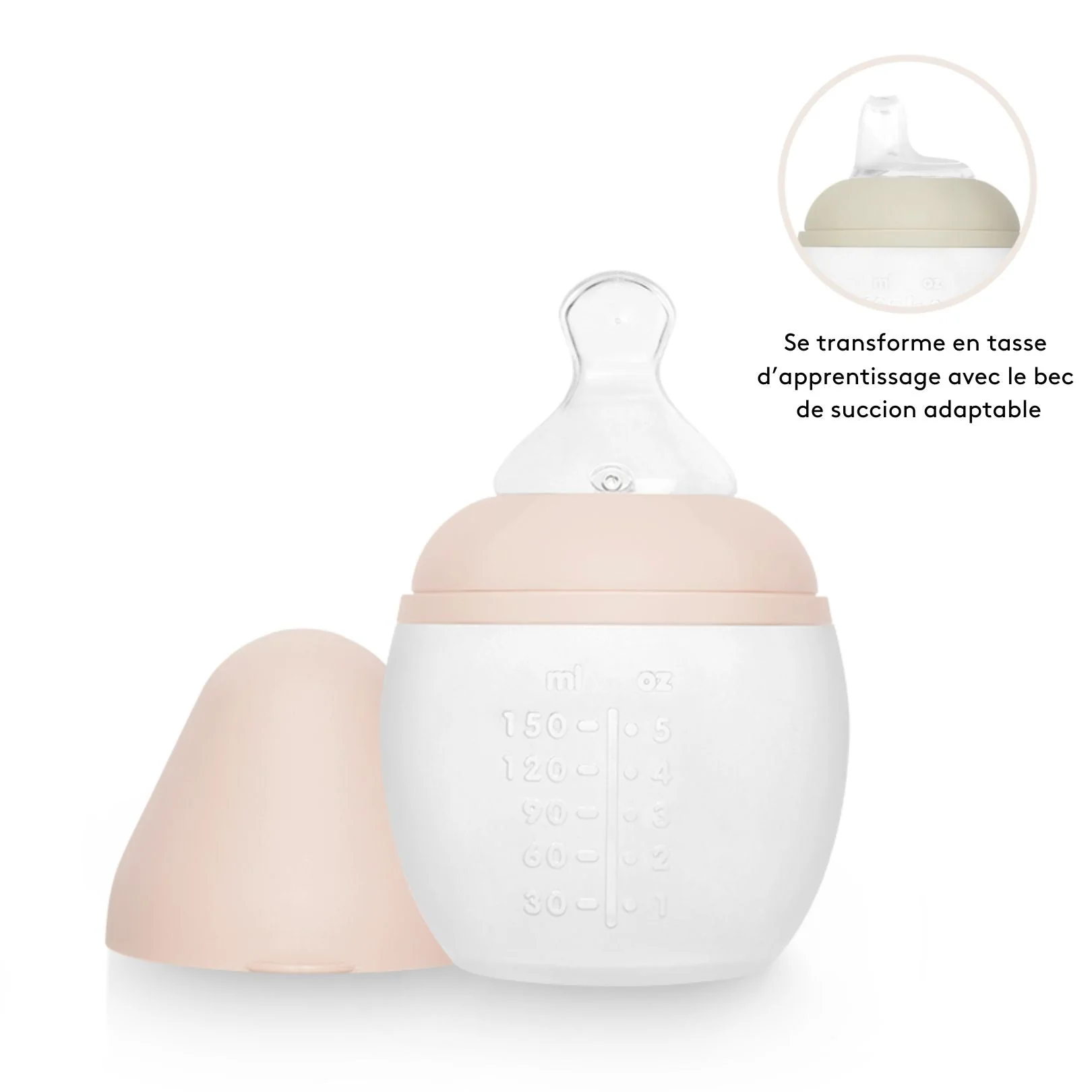 - Biberon évolutif qui se transforme en petit pot grâce à l'opercule fourni dans la boîte du biberon puis en tasse d'apprentissage avec les becs de succion (vendus séparément).